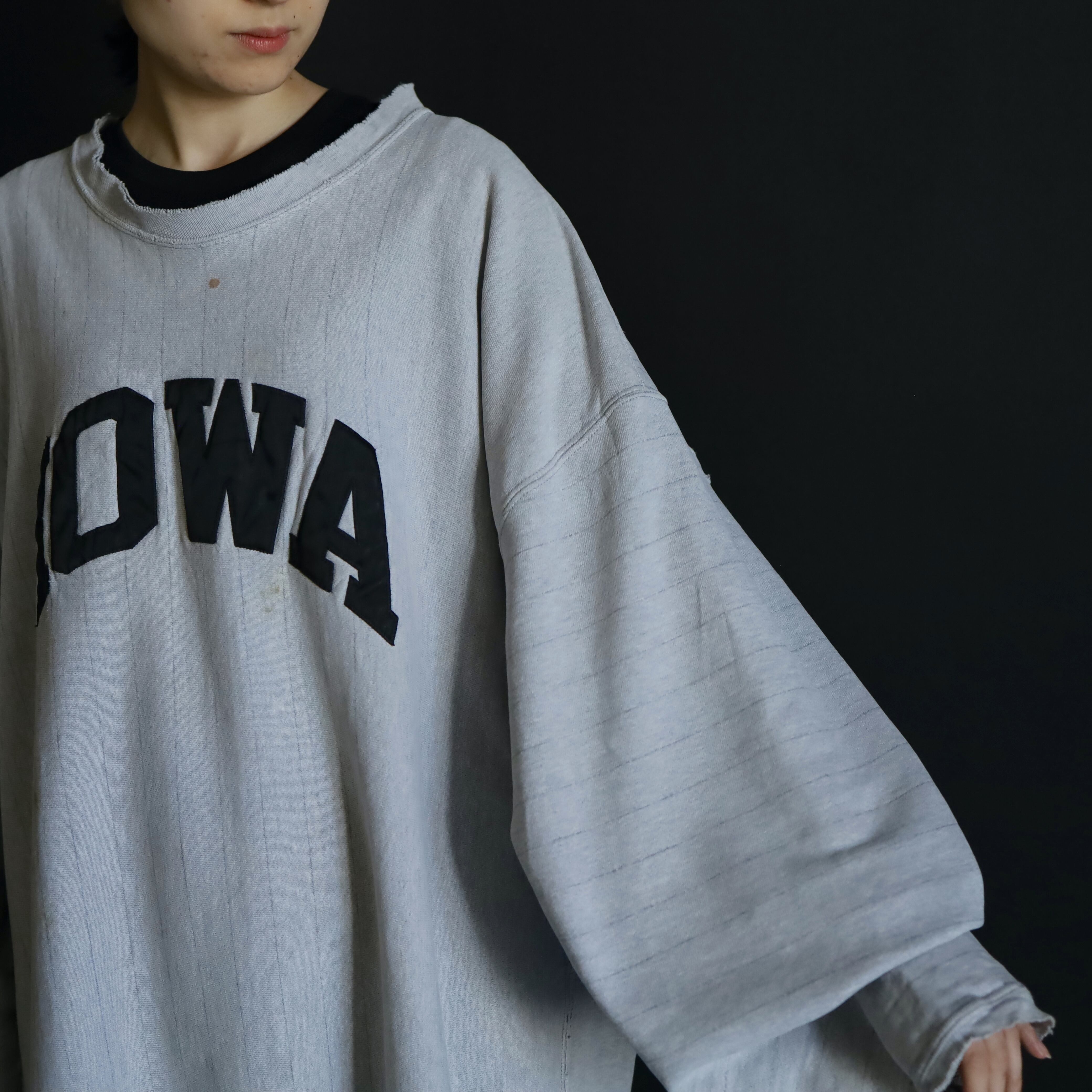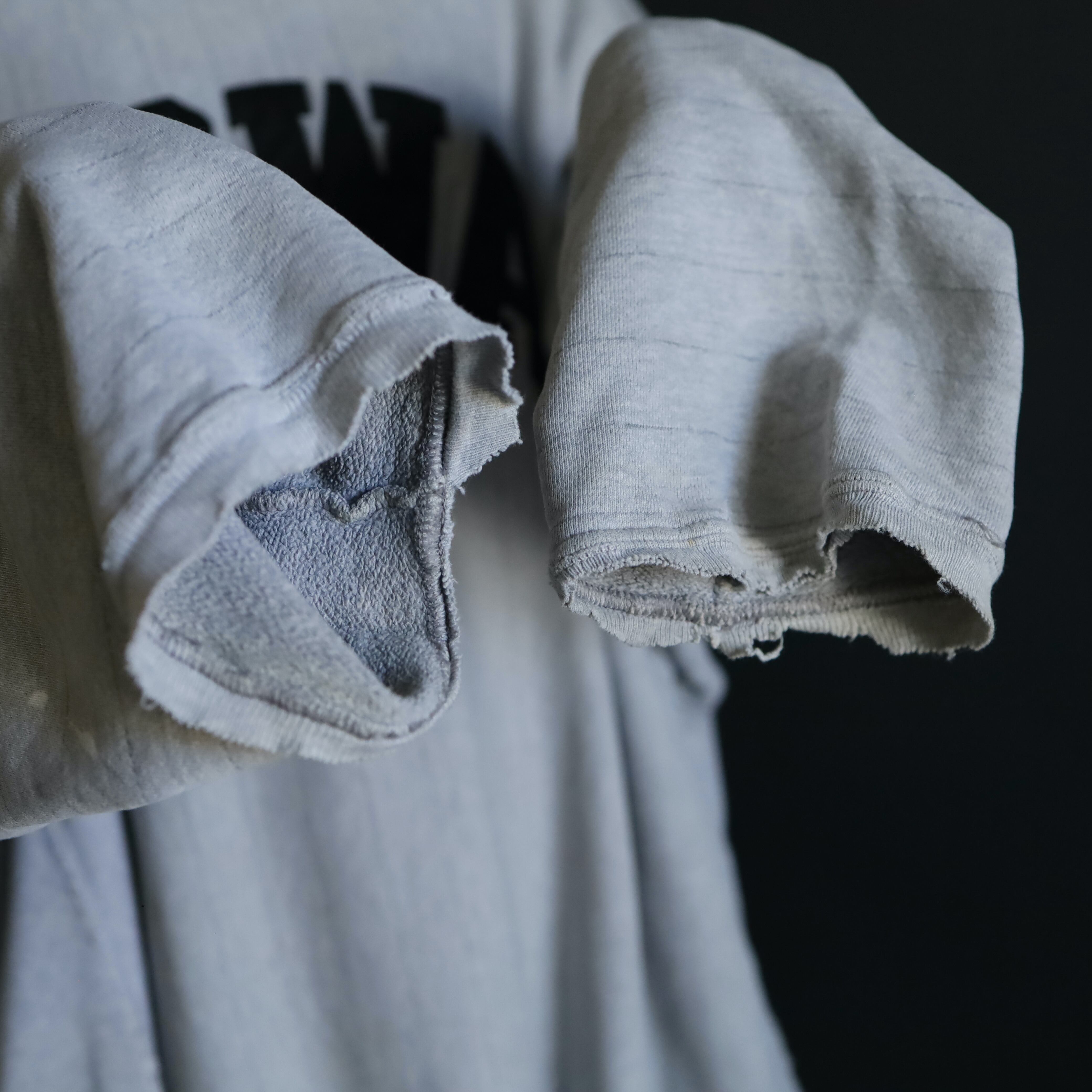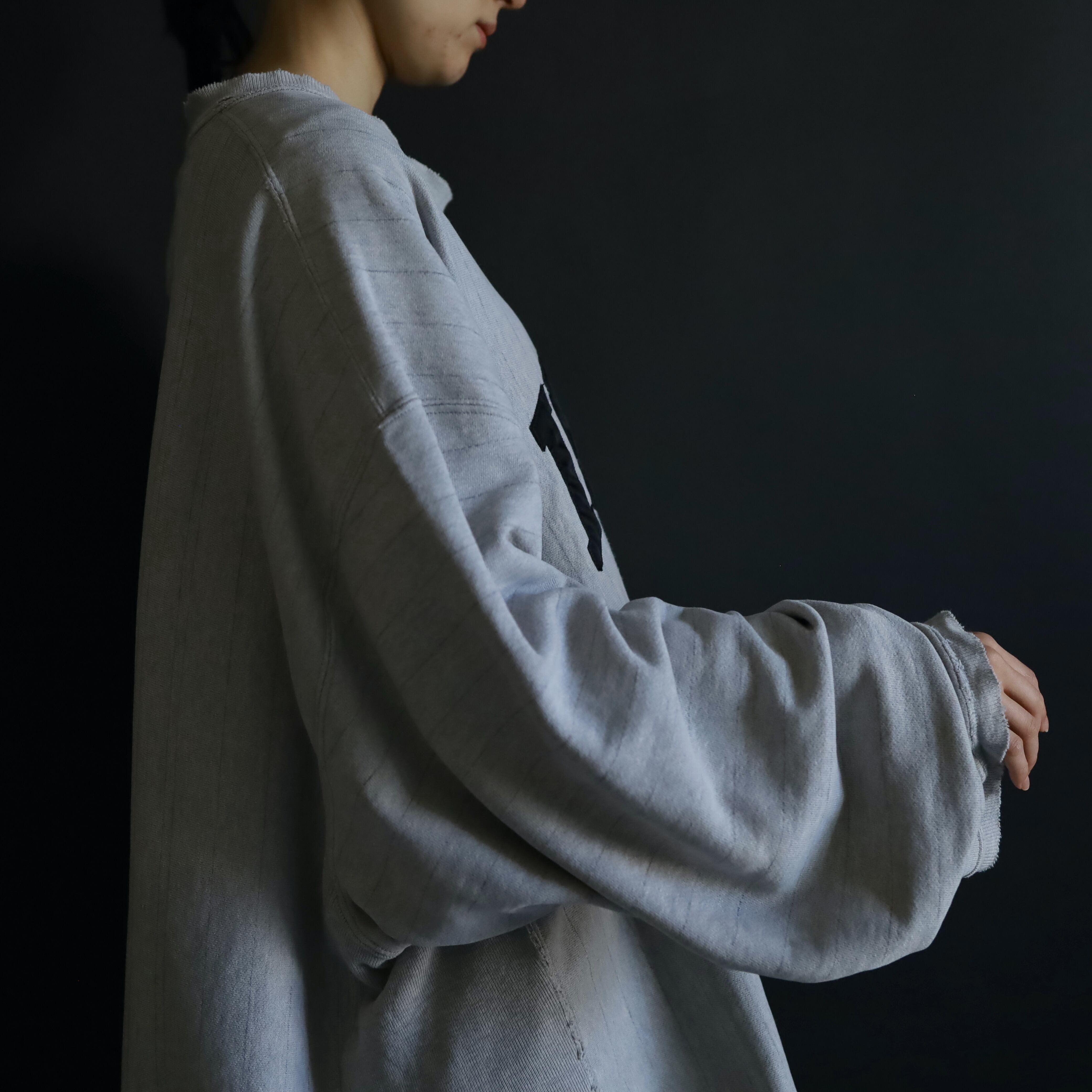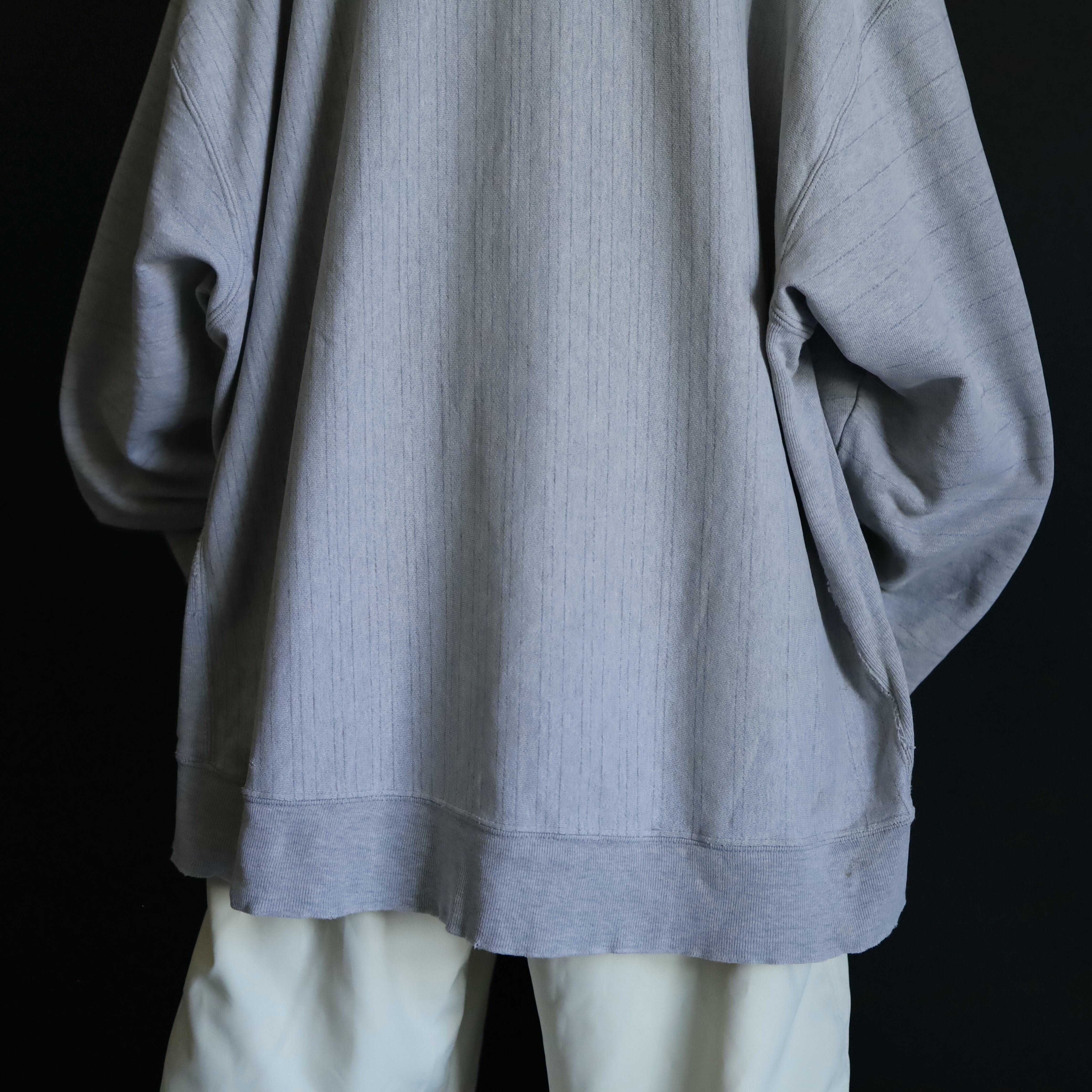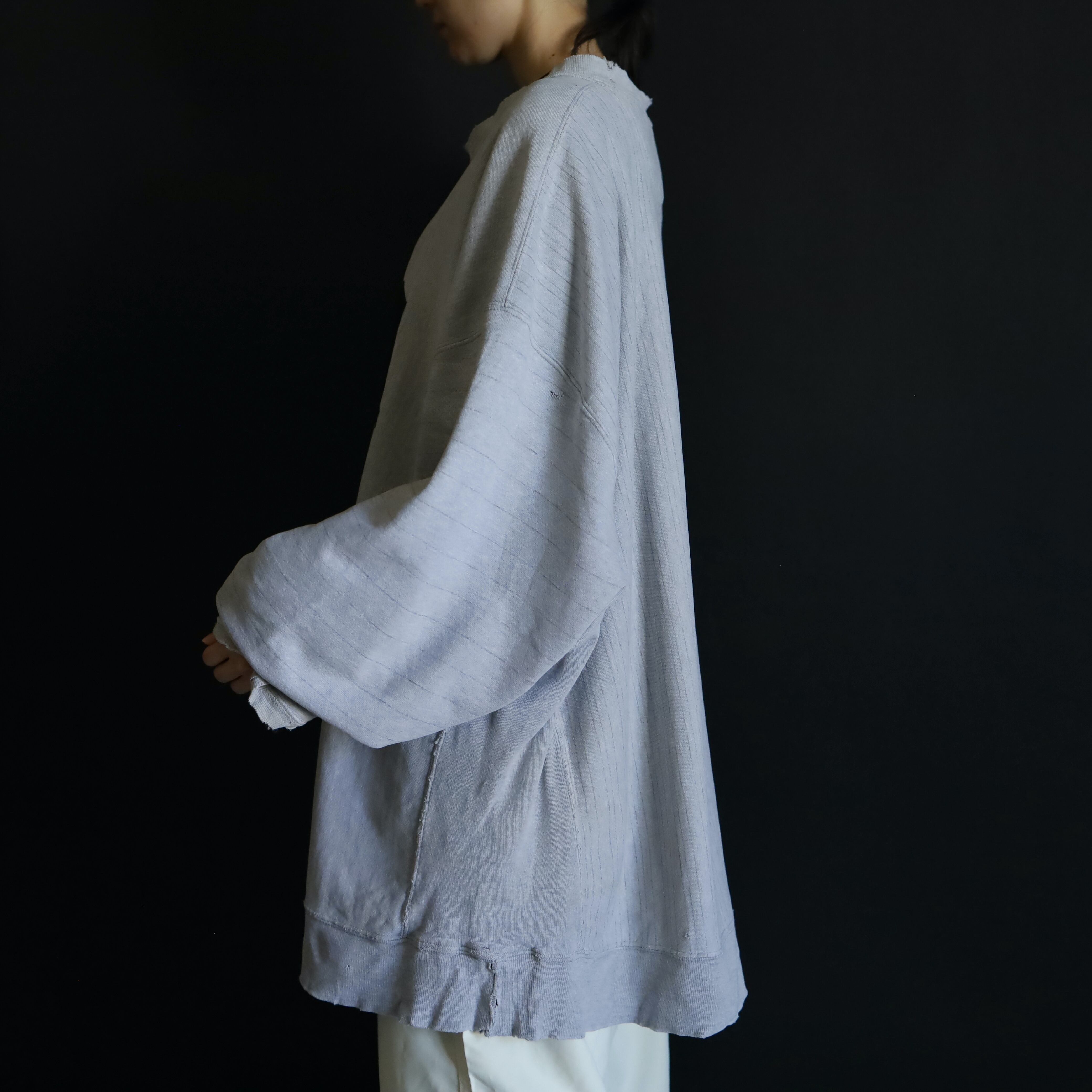袖は袖先のリブ中間でぶった切られ,ネックリブや裾リブも擦れやほつれが強く,生地全体にグランジ感の表れた一枚になっています.