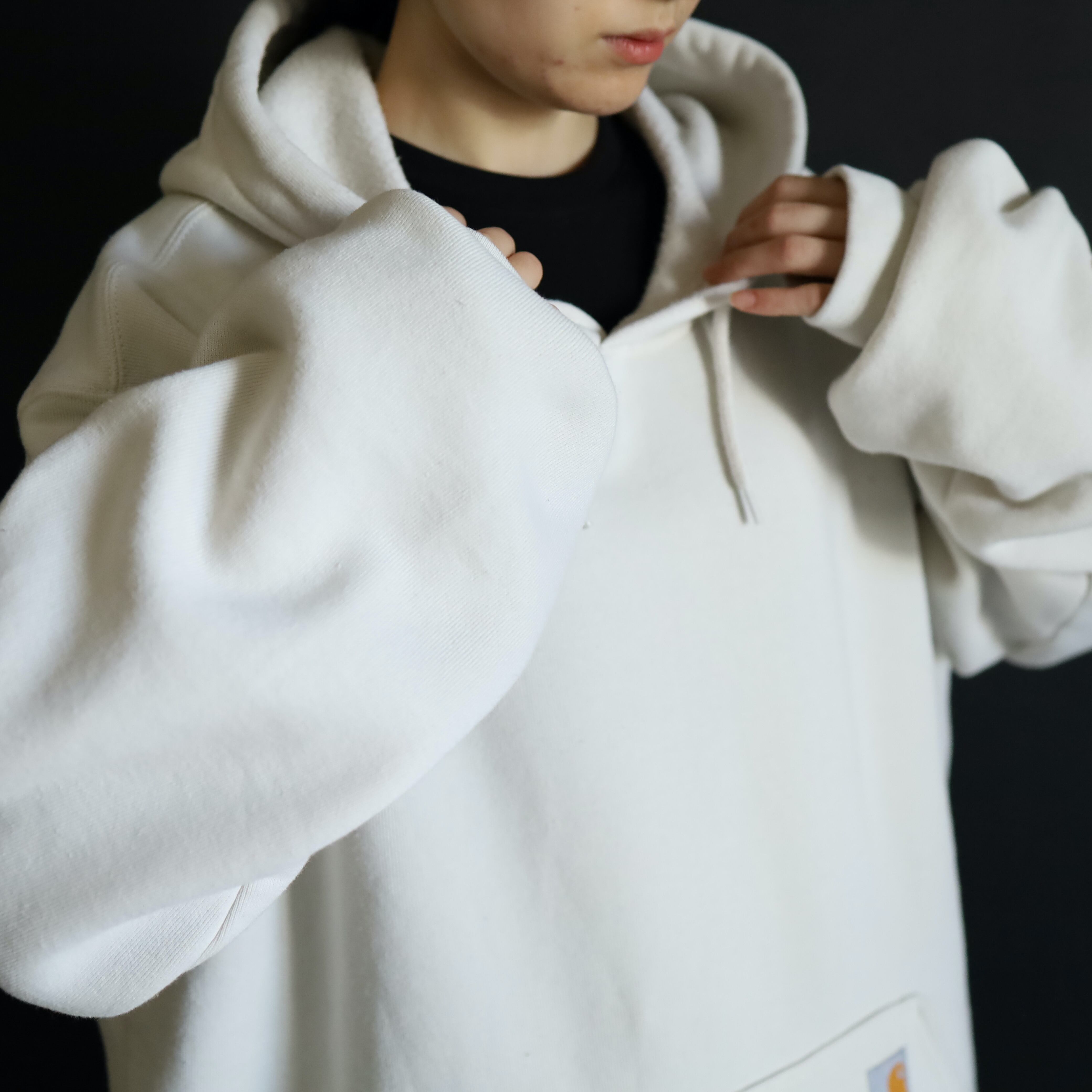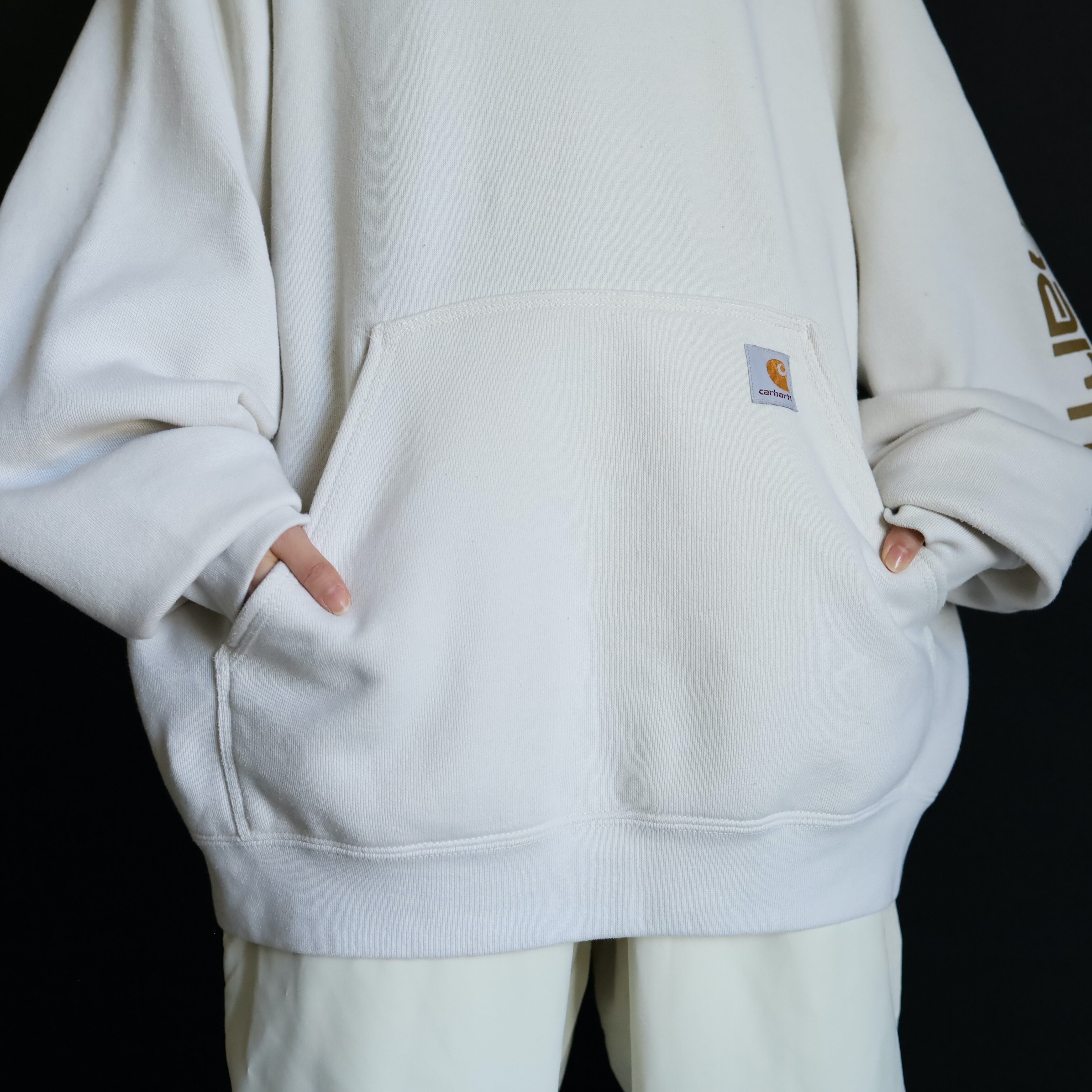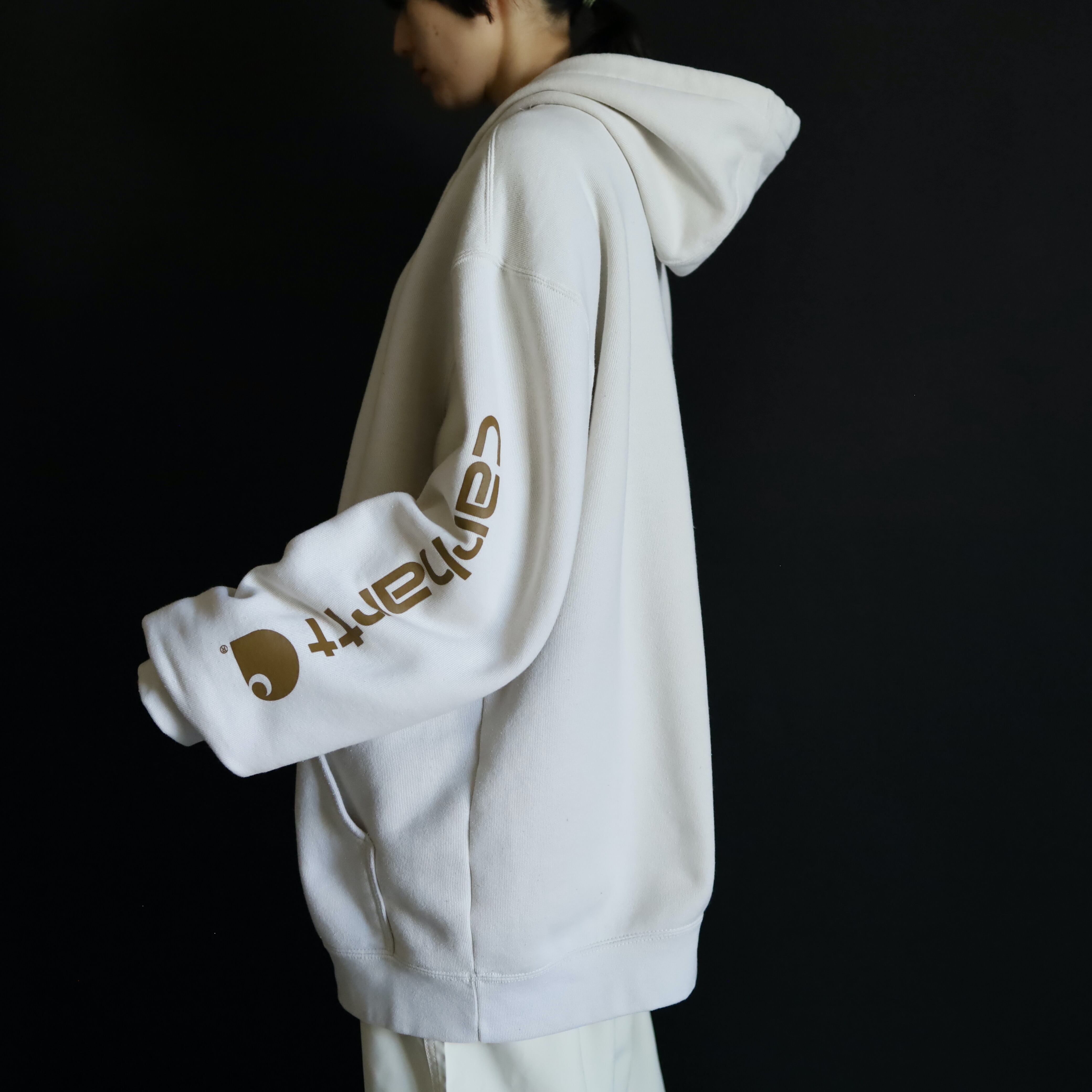 マフポケットのロゴデザインに加え,左袖にはラバープリントがデザインされた,カーハートらしさのある定番人気の一枚です.